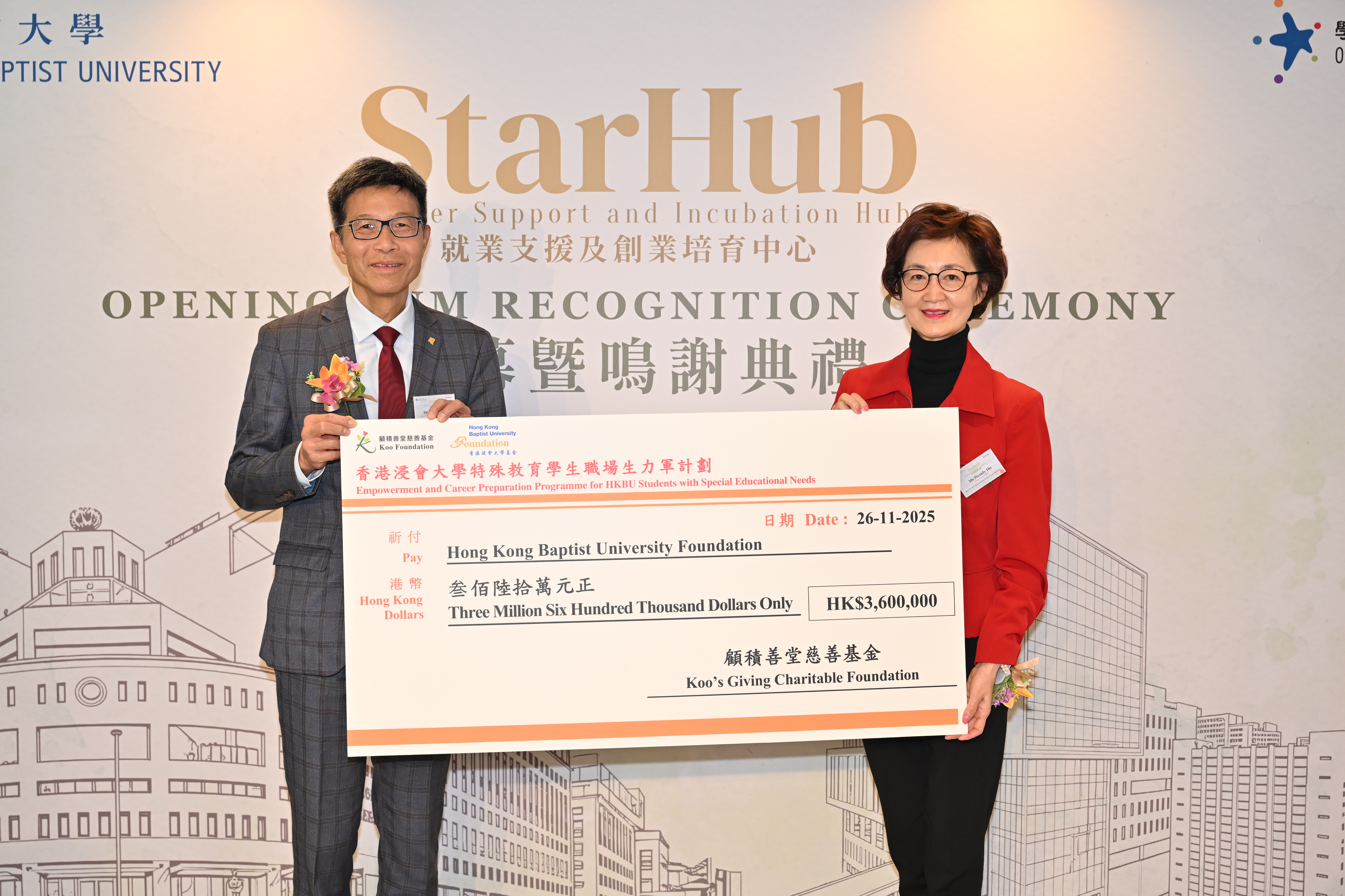 The Career Centre of the Office of Student Affairs hosted the Grand Opening and Recognition Ceremony of StarHub – Career Support and Incubation Hub on 26 November. At the ceremony, the University announced a generous donation of HK$3.6 million from the Koo’s Giving Charitable Foundation to support the launch of the “Empowerment and Career Preparation Program for HKBU Students with Special Educational Needs”.